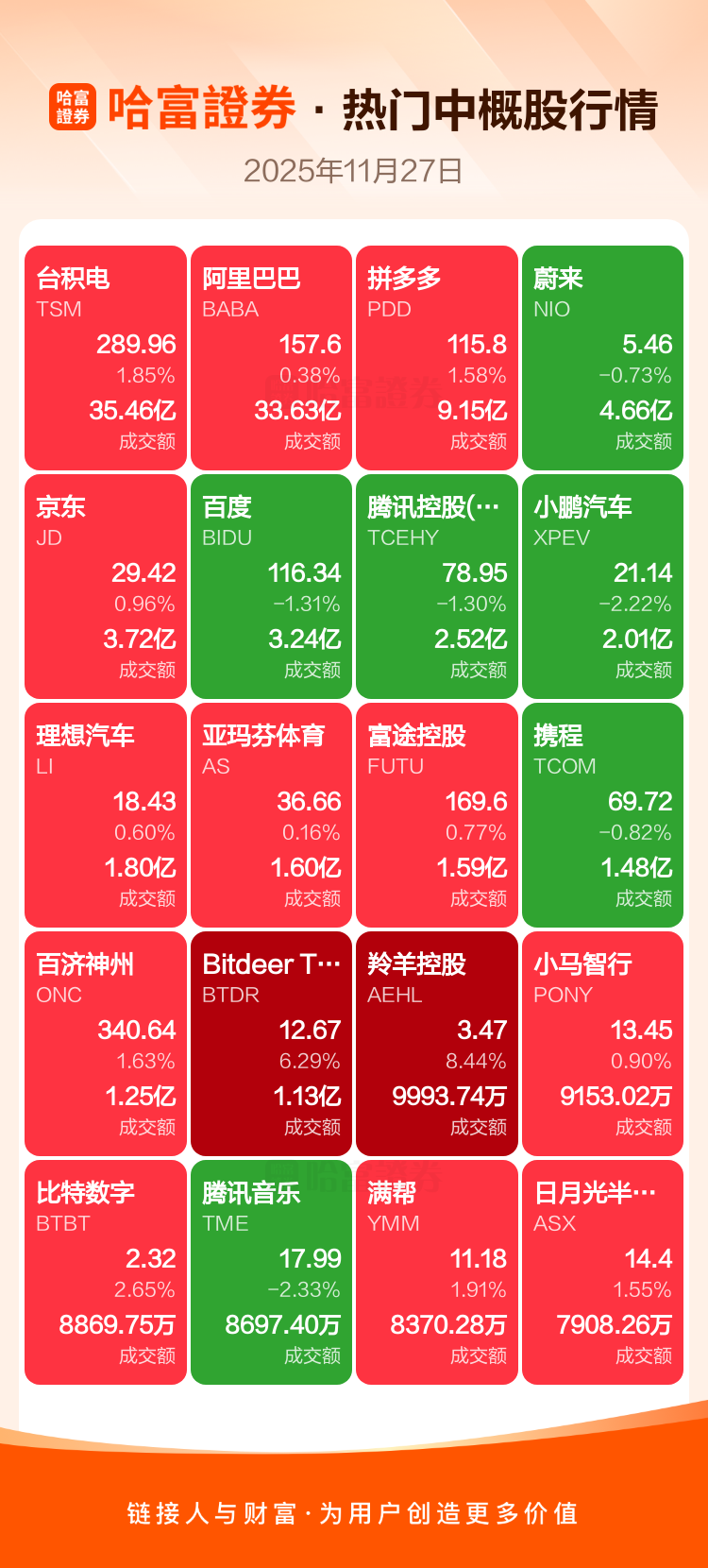 台积电涨1.85%,阿里巴巴涨0.38%,拼多多涨1.58%,蔚来跌0.73%,京东涨0.96%,百度跌1.31%,腾讯控股(ADR)跌1.30%,小鹏汽车跌2.22%,理想汽车涨0.60%,亚玛芬体育涨0.16%。