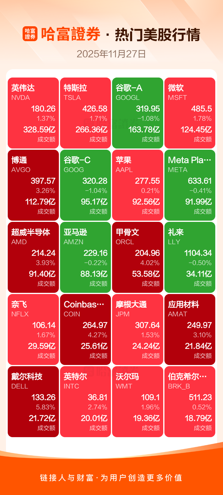 英伟达涨1.37%,特斯拉涨1.71%,谷歌-A跌1.08%,微软涨1.78%,博通涨3.26%,谷歌-C跌1.04%,苹果涨0.21%,Meta Platforms Inc-A跌0.41%,超威半导体涨3.93%,亚马逊跌0.22%。