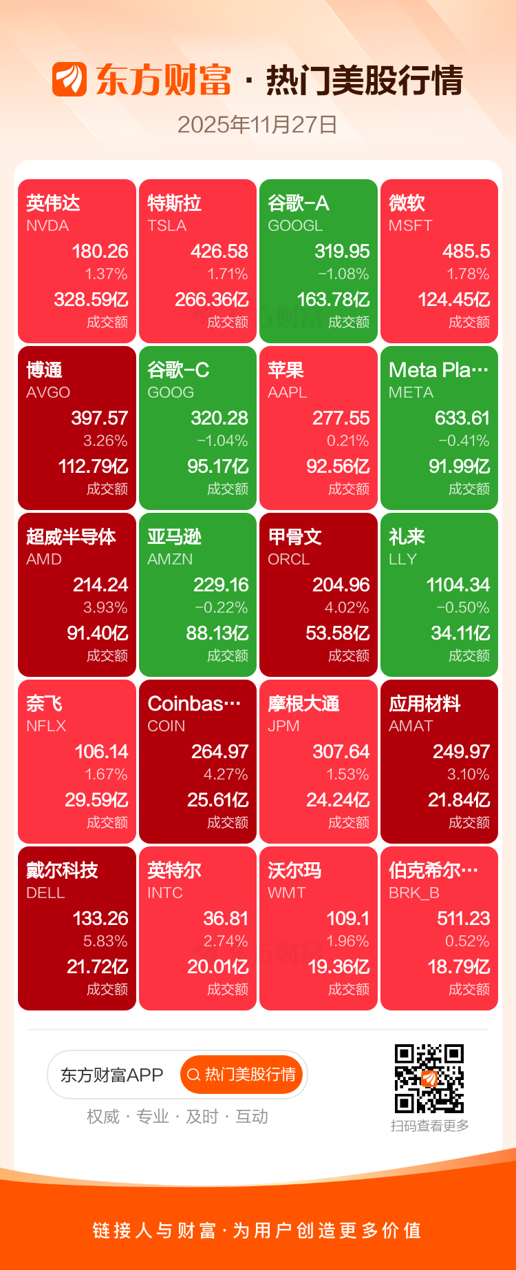英伟达涨1.37%,特斯拉涨1.71%,谷歌-A跌1.08%,微软涨1.78%,博通涨3.26%,谷歌-C跌1.04%,苹果涨0.21%,Meta Platforms Inc-A跌0.41%,超威半导体涨3.93%,亚马逊跌0.22%。