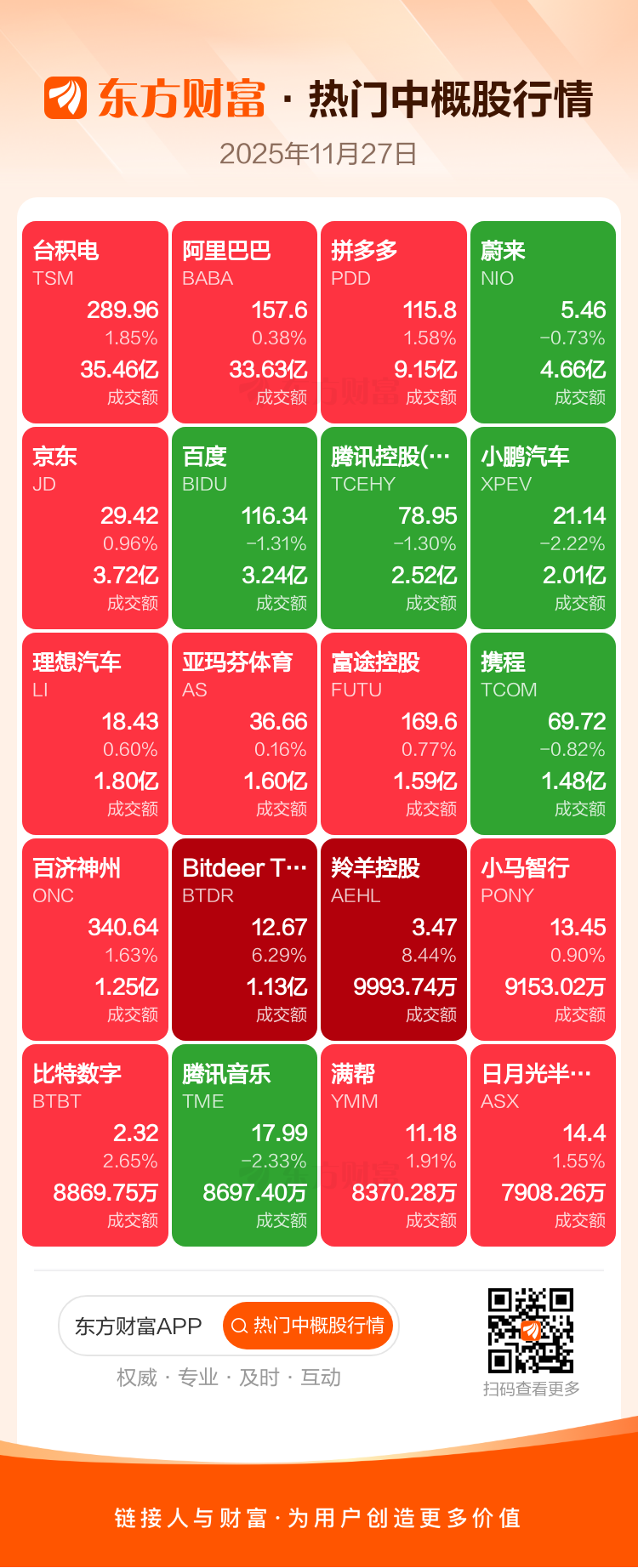 台积电涨1.85%,阿里巴巴涨0.38%,拼多多涨1.58%,蔚来跌0.73%,京东涨0.96%,百度跌1.31%,腾讯控股(ADR)跌1.30%,小鹏汽车跌2.22%,理想汽车涨0.60%,亚玛芬体育涨0.16%。