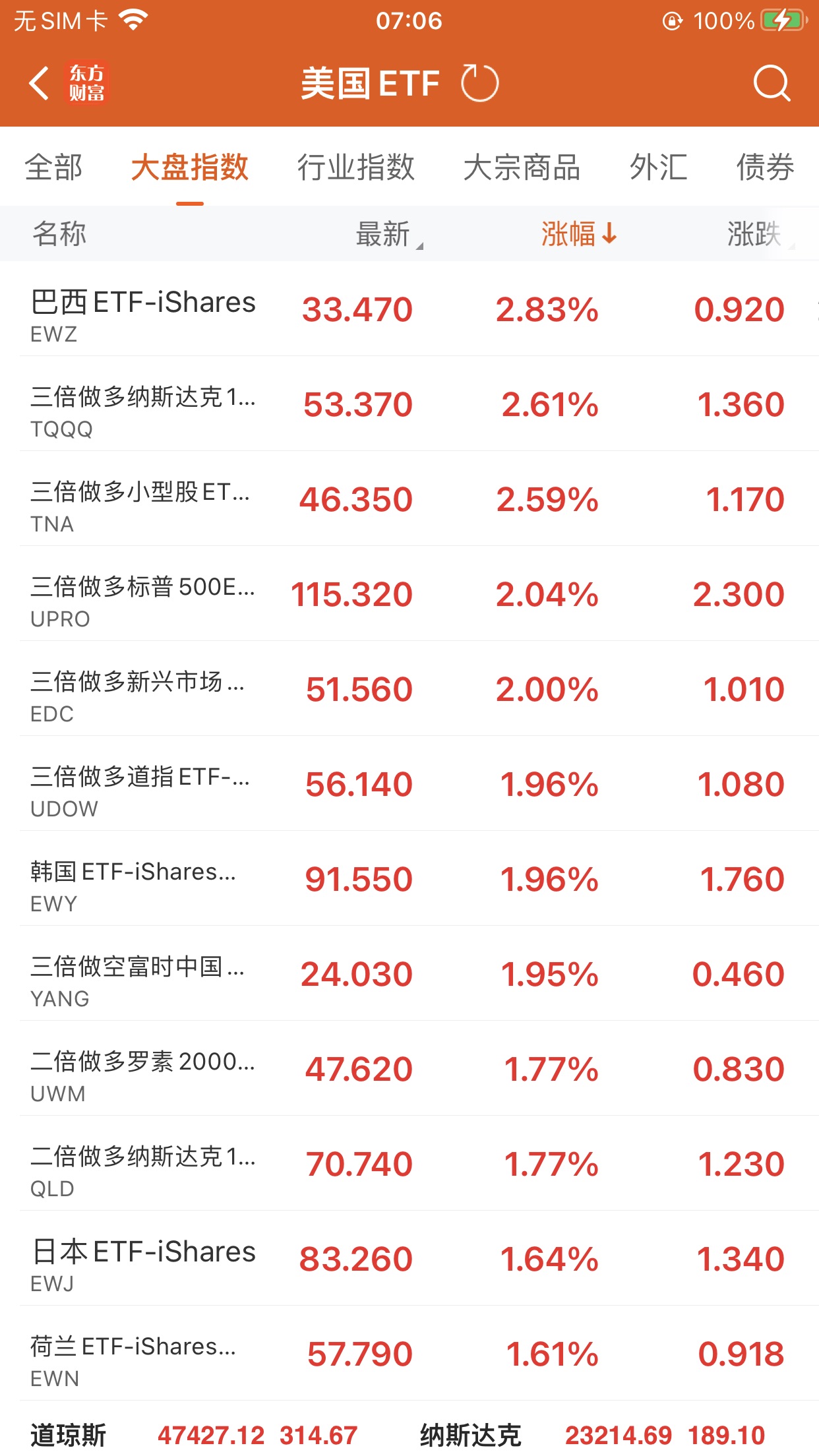 三倍做多道指30ETF-ProShares(UDOW.US) 升2.00%,成交额1.33亿美元。