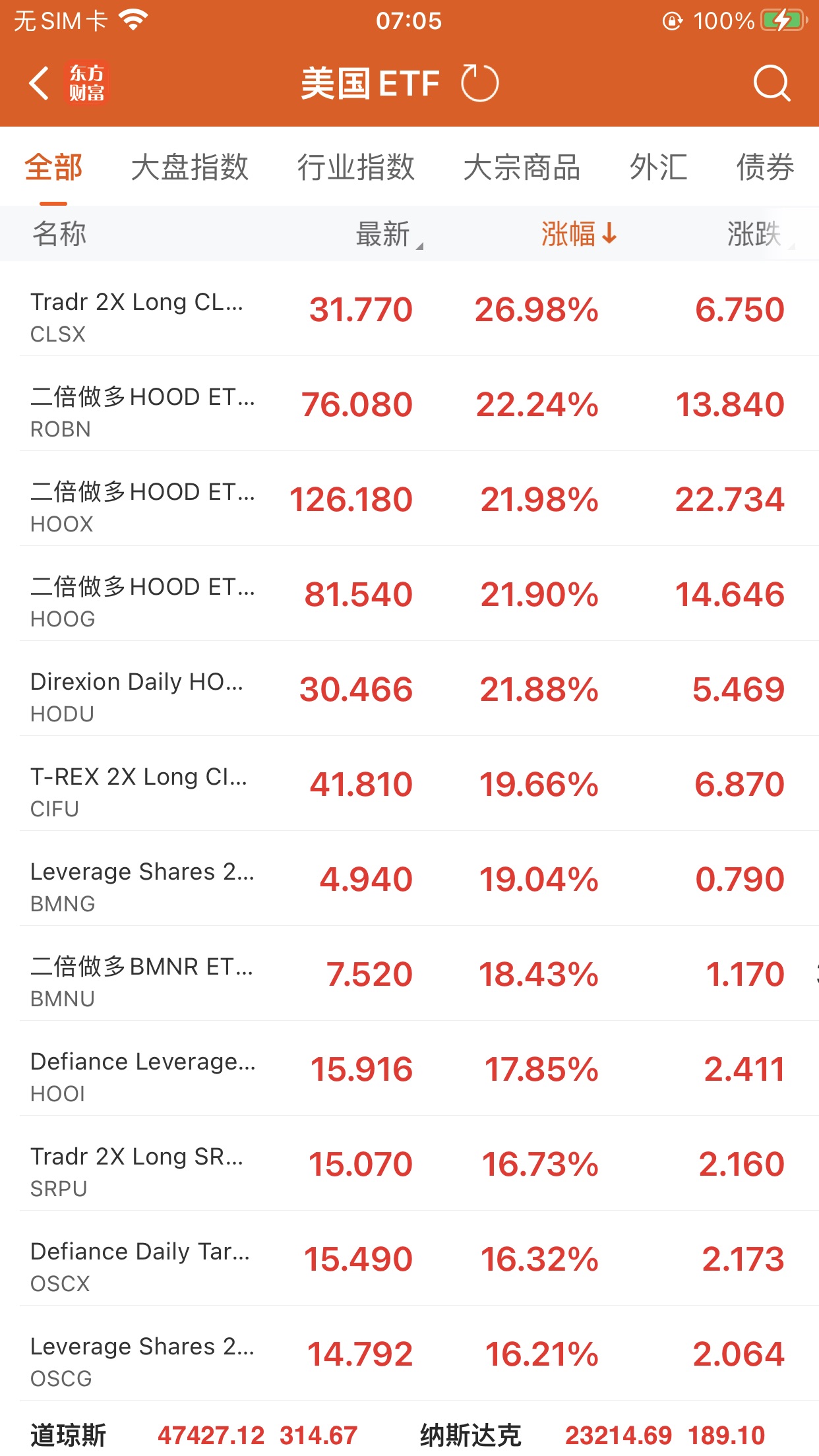 2倍做多HOOD ETF-Defiance(HOOX.US) 升21.98%,成交额957.57万美元。