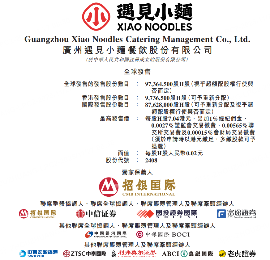 遇见小面于11月27日至12月2日招股,公司拟全球发售9736.45万股H股,香港公开发售占10%,国际发售占90%,另有5%超额配股权。每股发售价5.64-7.04港元,每手500股,预期H股将于12月5日在联交所开始买卖。