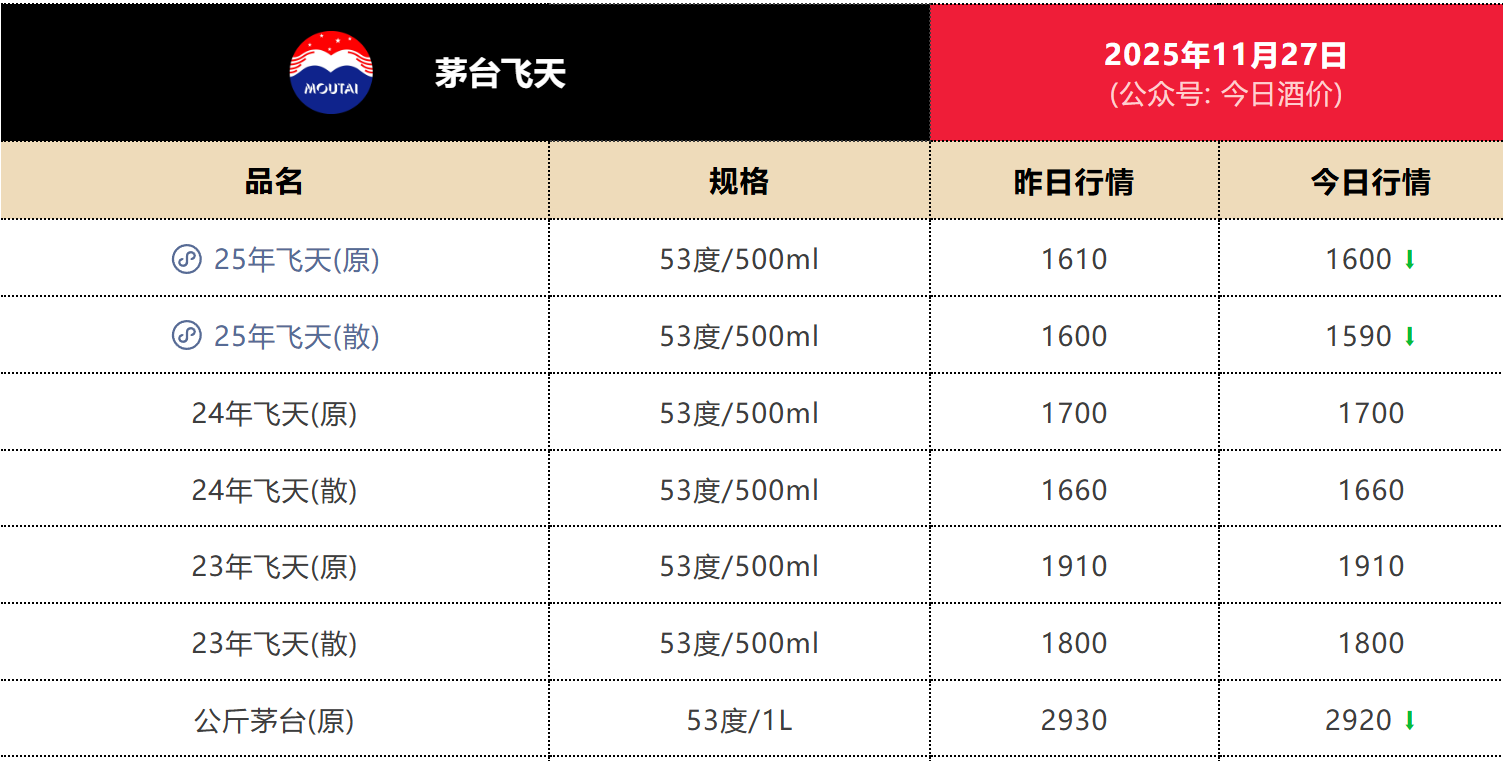 上证报中国证券网讯(记者高志刚)据酒业数据平台“今日酒价”11月27日最新数据显示,25年飞天(散)53度/500ml批发价为1590元/瓶,较昨日下跌10元;25年飞天(原)53度/500ml价格报1600元/瓶,较昨日下跌10元。