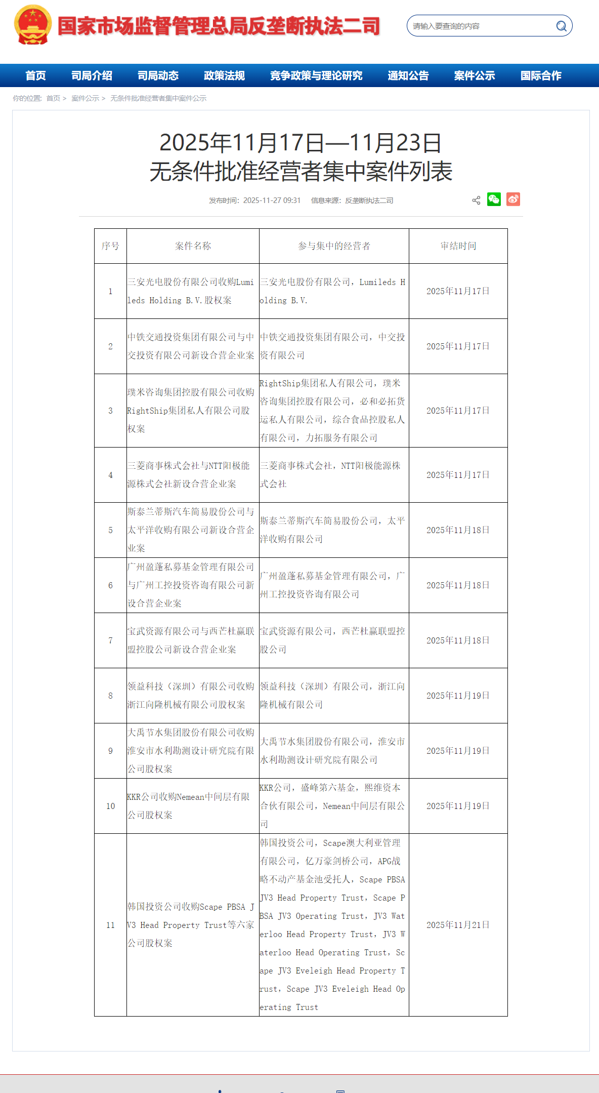 11月27日消息,市场监管总局发布2025年11月17日—11月23日无条件批准经营者集中案件列表,其中包括三安光电股份有限公司收购Lumileds Holding B.V.股权案、领益科技(深圳)有限公司收购浙江向隆机械有限公司股权案等。
