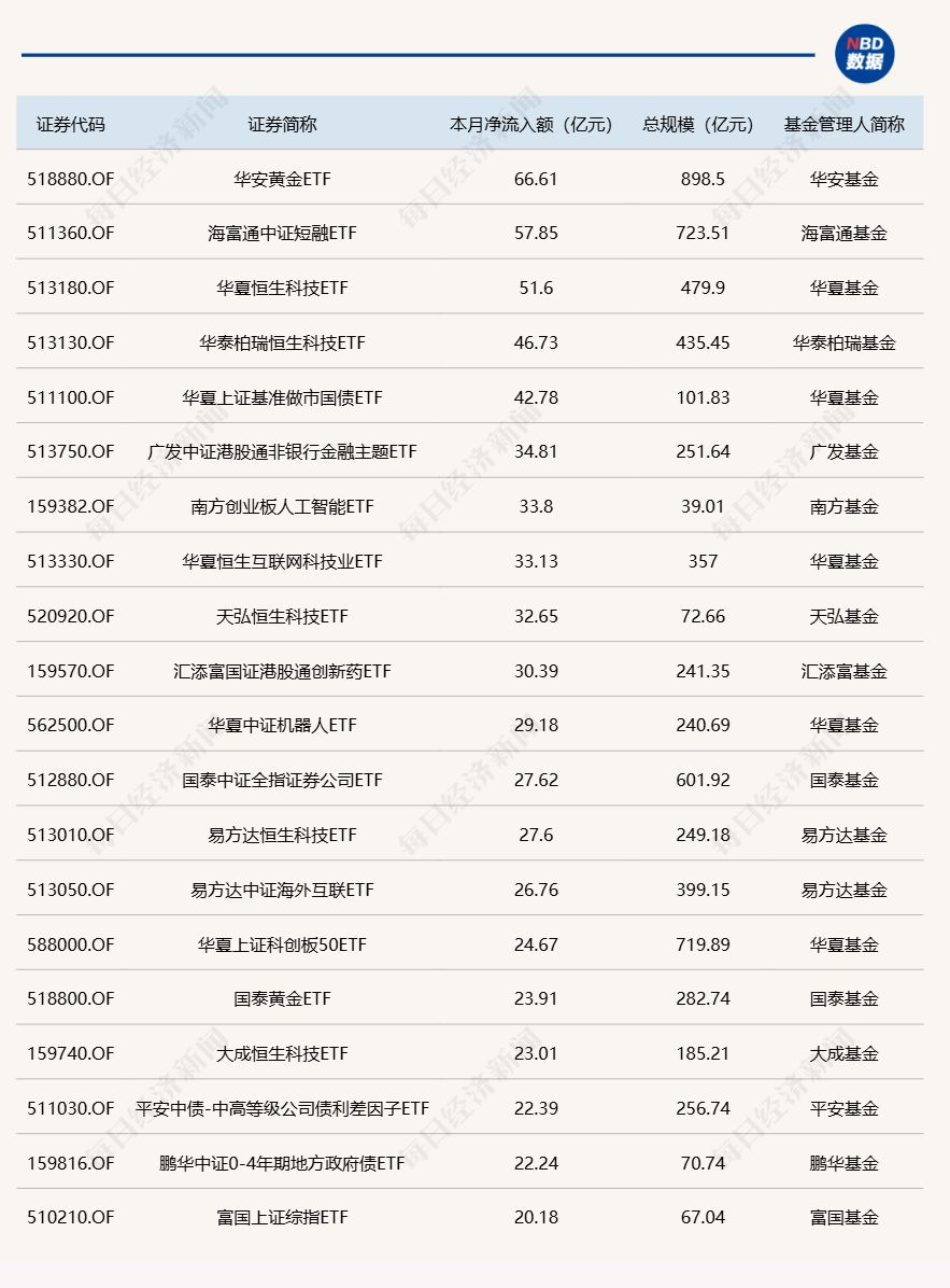截至11月26日,本月资金净流入额居前20的ETF名单如下: