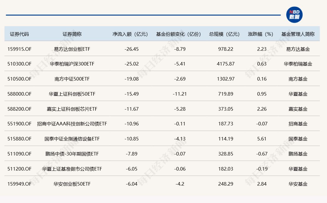 与此同时,易方达创业板ETF基金份额减少8.79亿份,对应资金净流出26.45亿元;华泰柏瑞沪深300ETF份额减少5.41亿份,出现净流出25.02亿元;南方中证500ETF份额减少2.69亿份,录得净流出19.08亿元。