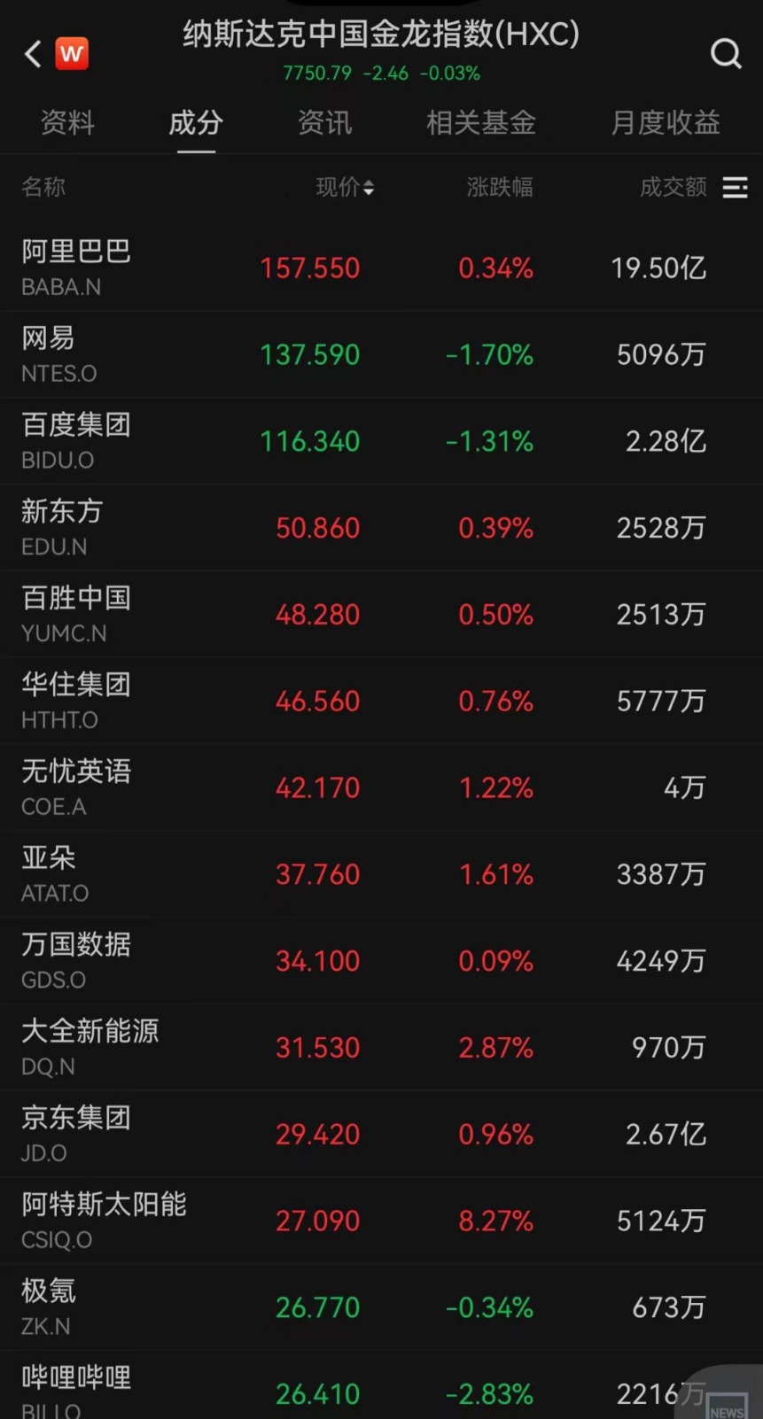 纳斯达克中国金龙指数下跌0.03%。阿里巴巴、百胜中国、华住集团分别上涨0.34%、0.50%、0.76%,网易、百度集团、哔哩哔哩分别下跌1.70%、1.31%、2.83%。