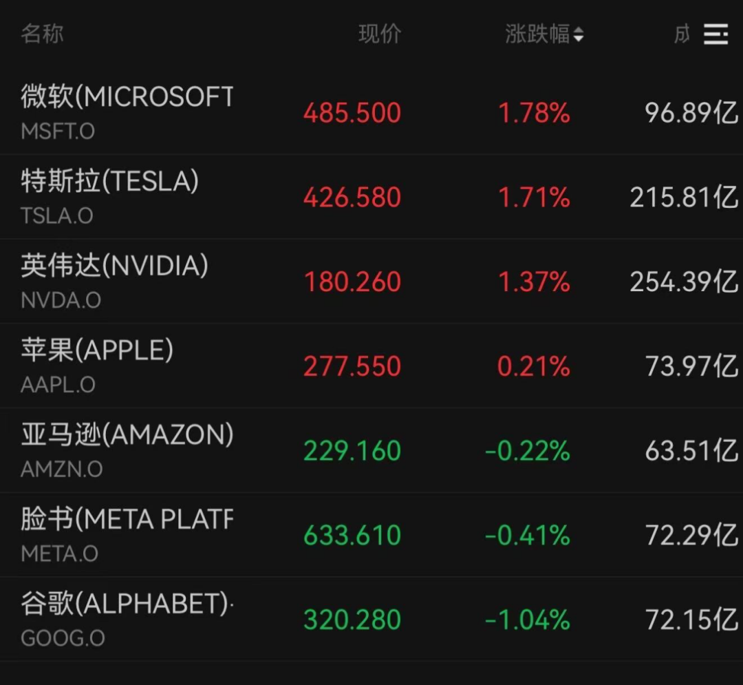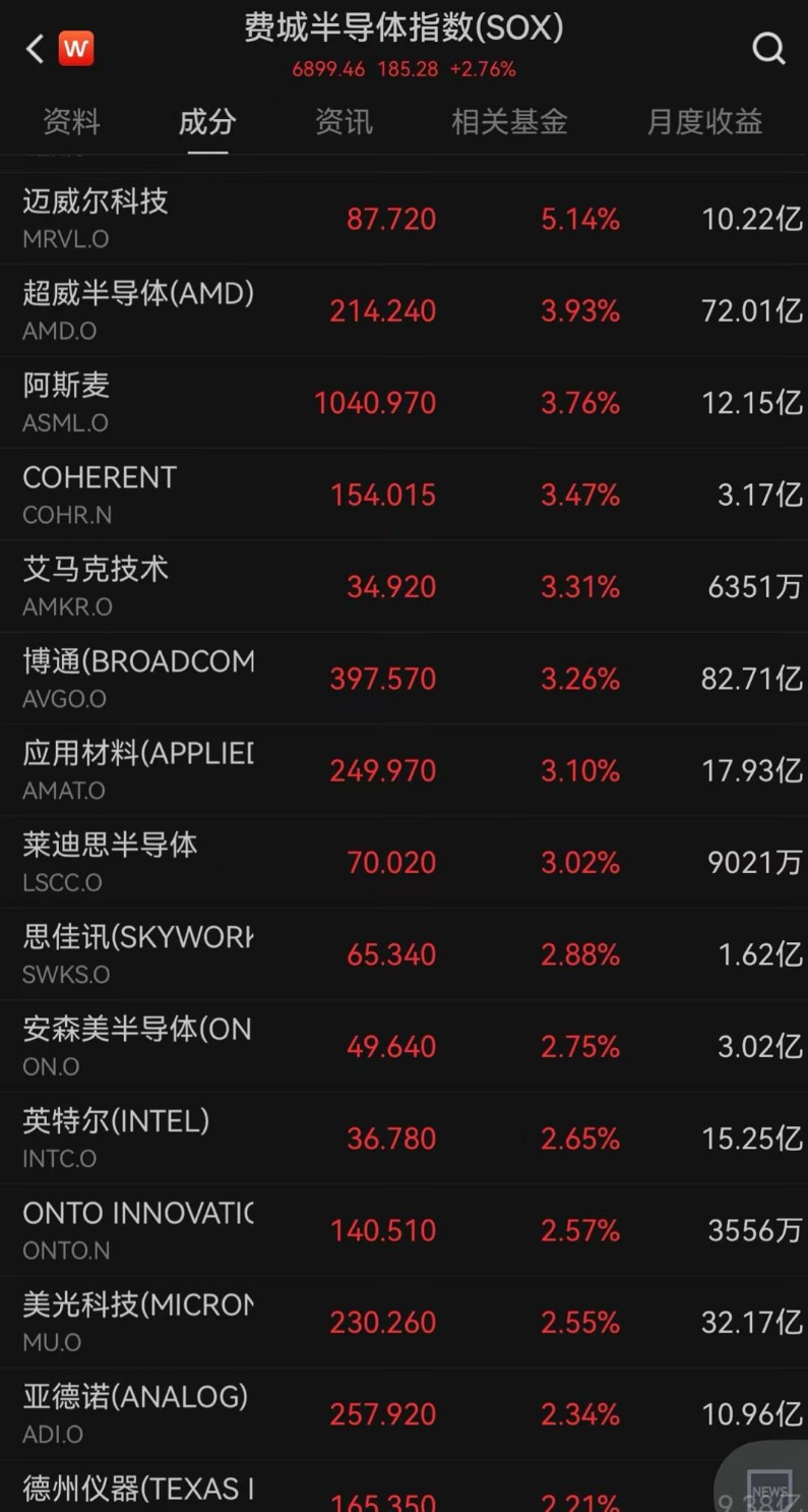 科技“七巨头”中,微软、特斯拉、英伟达分别上涨1.78%、1.71%、1.37%。芯片股走强,费城半导体指数上涨2.76%。迈威尔科技、超威半导体、阿斯麦分别上涨5.14%、3.93%、3.76%。
