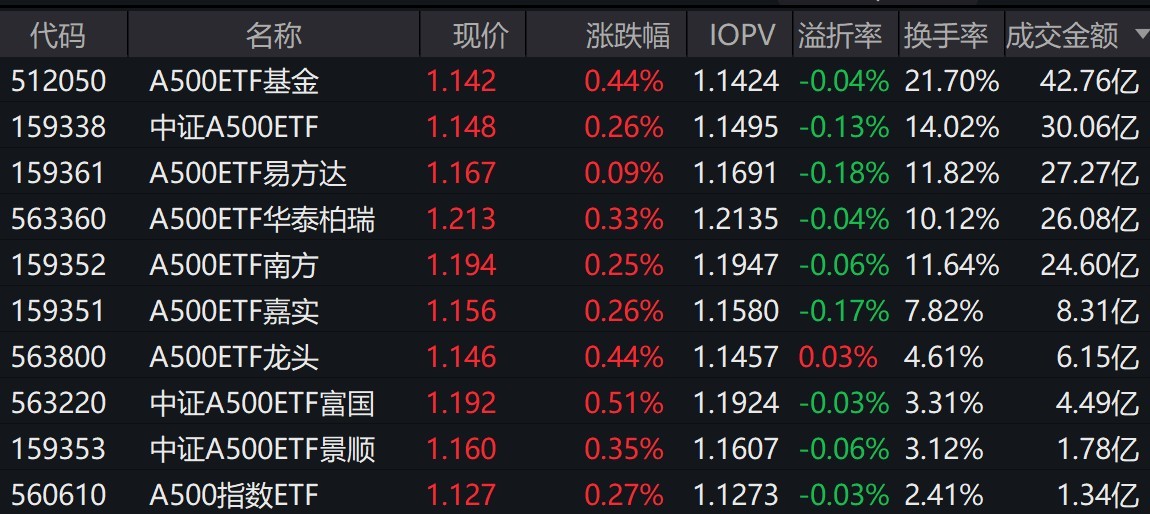 截至上午收盘,场内跟踪中证A500指数的ETF小幅上涨。其中,有10只中证A500相关ETF成交额超1亿元,3只超27亿元。A500ETF基金、中证A500ETF、A500ETF易方达早盘成交额分别为42.76亿元、30.06亿元、27.27亿元。