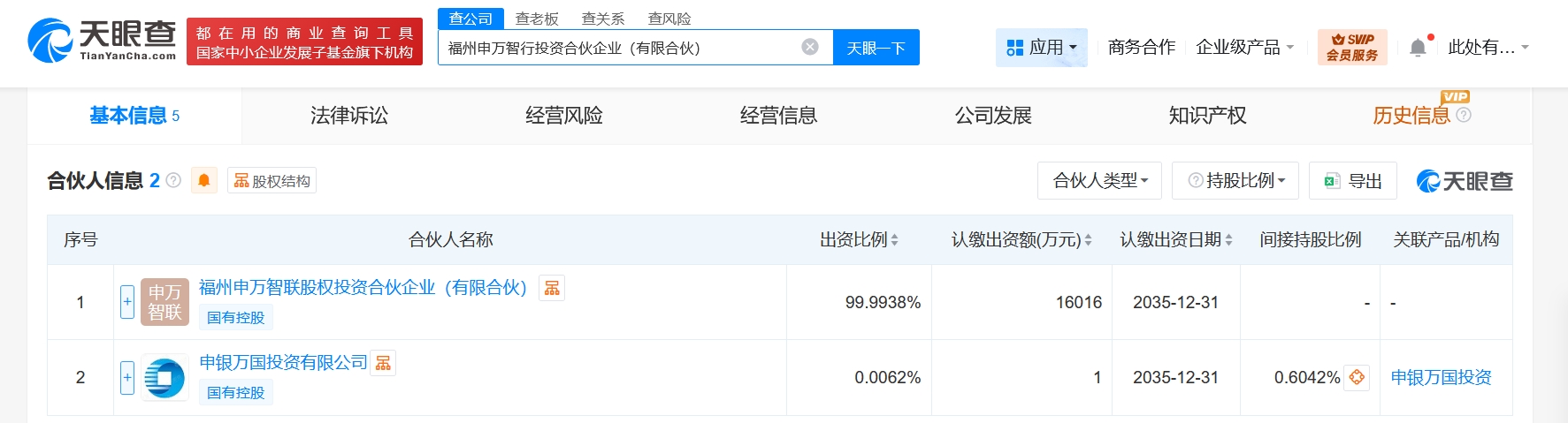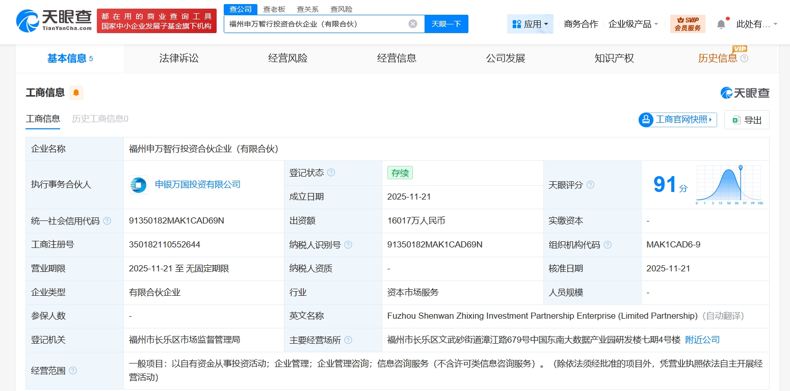 每经AI快讯,天眼查工商信息显示,近日,福州申万智行投资合伙企业(有限合伙)成立,执行事务合伙人为申银万国投资有限公司,出资额约1.6亿元人民币,经营范围为以自有资金从事投资活动、企业管理、企业管理咨询、信息咨询服务。合伙人信息显示,该合伙企业由申万宏源(000166)旗下申银万国投资有限公司、福州申万智联股权投资合伙企业(有限合伙)共同出资。