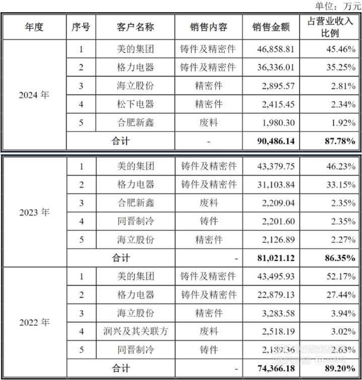 招股书显示,2022年至2024年(简称:报告期内),南特科技向前五大客户的销售收入分别为7.44亿元、8.10亿元和9.05亿元,占营收比例分别为89.20%、86.35%和87.78%。在前五大客户名单中,美的集团和格力电器长期占据前两位,且对业绩的贡献尤为突出。