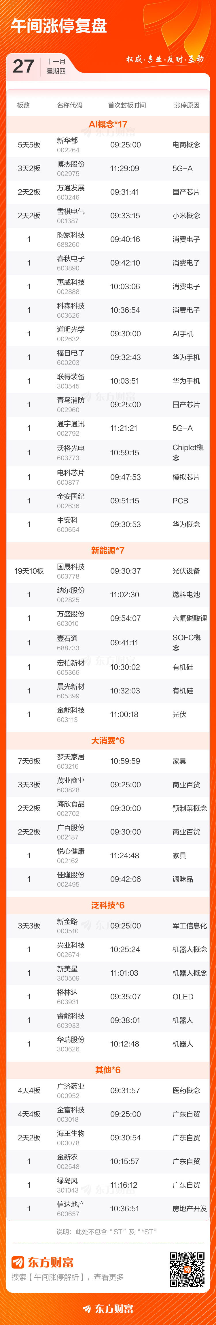 11月27日午间涨停复盘:53股涨停 新华都5天5板