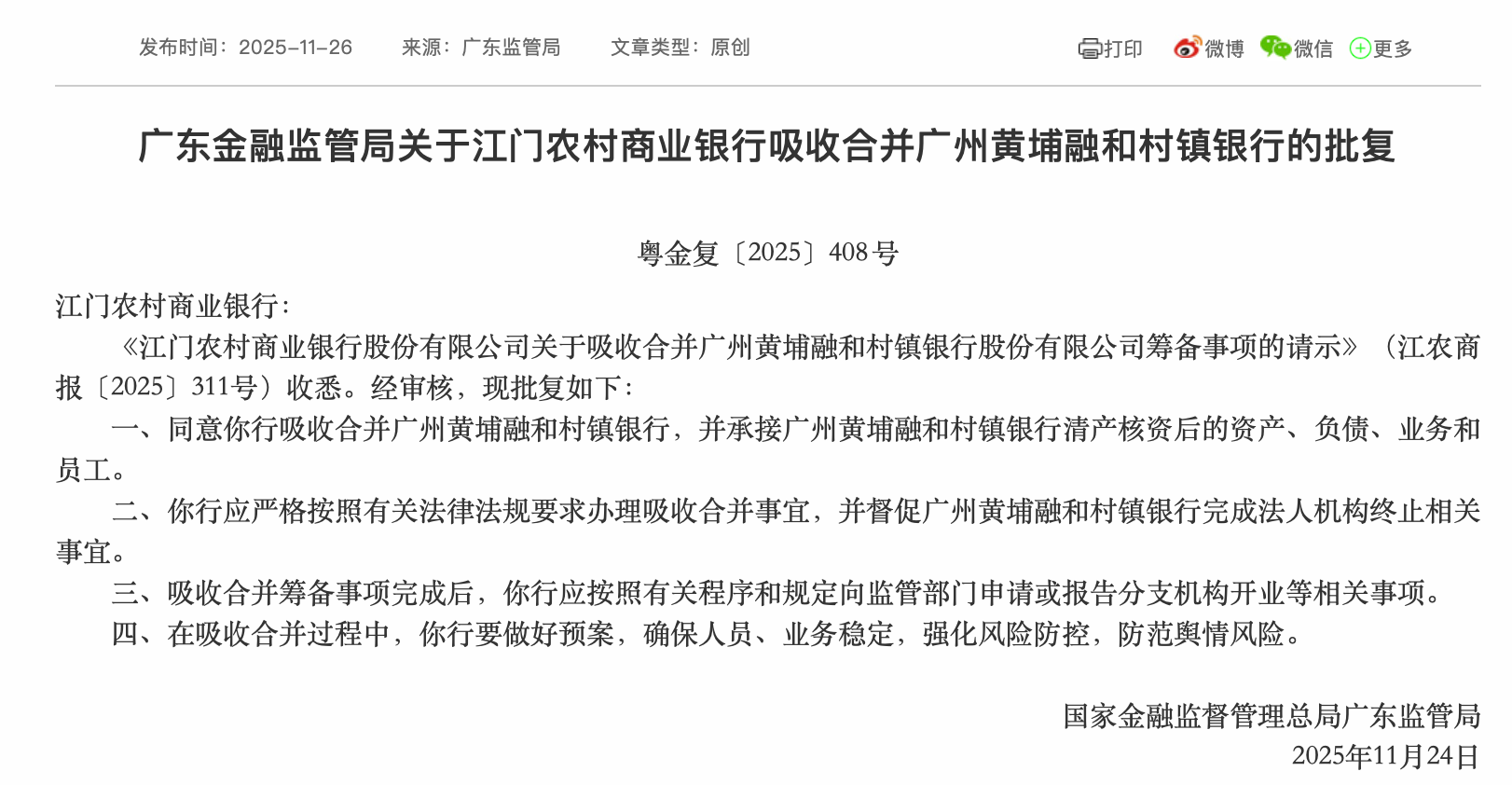 近日,广东金融监管局发布关于江门农村商业银行吸收合并广州黄埔融和村镇银行的批复,同意该行吸收合并广州黄埔融和村镇银行,并承接广州黄埔融和村镇银行清产核资后的资产、负债、业务和员工。