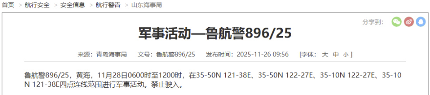 据中国海事局网站消息,青岛海事局发布航行警告,11月28日6时至12时,黄海部分海域进行军事活动,禁止驶入。