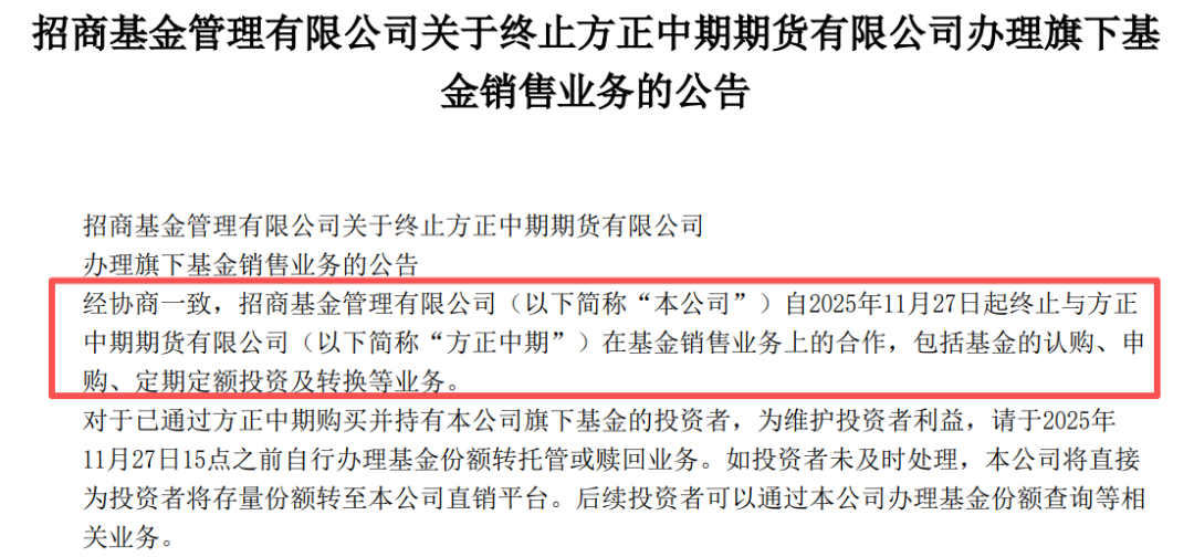 公告显示,经协商一致,招商基金自2025年11月27日起终止与方正中期期货有限公司(以下简称方正中期)在基金销售业务上的合作。