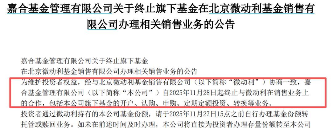 公告显示,为维护投资者权益,经与北京微动利基金销售有限公司(以下简称微动利)协商一致,嘉合基金自2025年11月28日起终止与微动利在销售业务上的合作。
