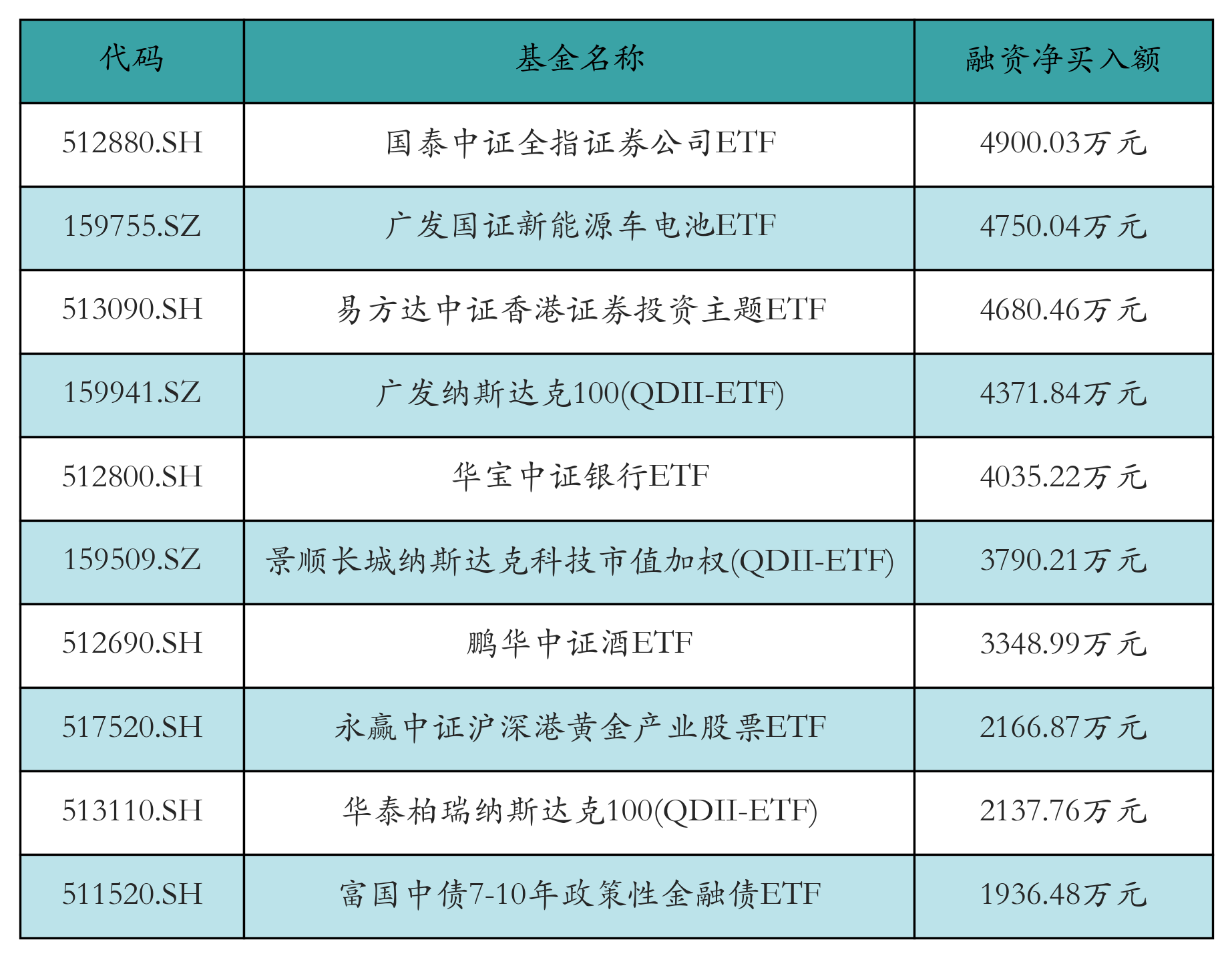 11月26日ETF融资净买入额前三位分别为:国泰中证全指证券公司ETF(4900.03万元)、广发国证新能源车电池ETF(4750.04万元)和易方达中证香港证券投资主题ETF(4680.46万元),前10具体见下表: