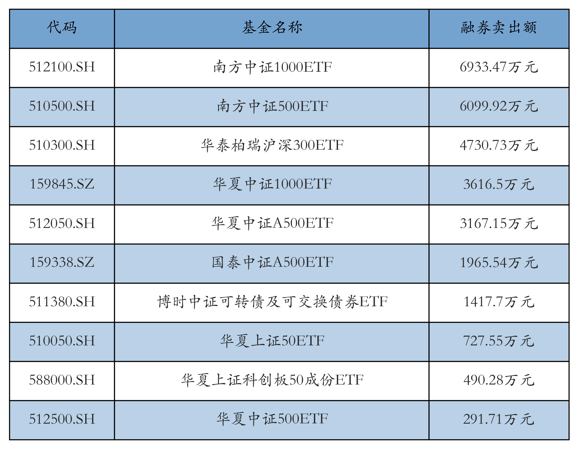 11月26日ETF融券卖出额前三位分别为:南方中证1000ETF(6933.47万元)、南方中证500ETF(6099.92万元)和华泰柏瑞沪深300ETF(4730.73万元),前10具体见下表: