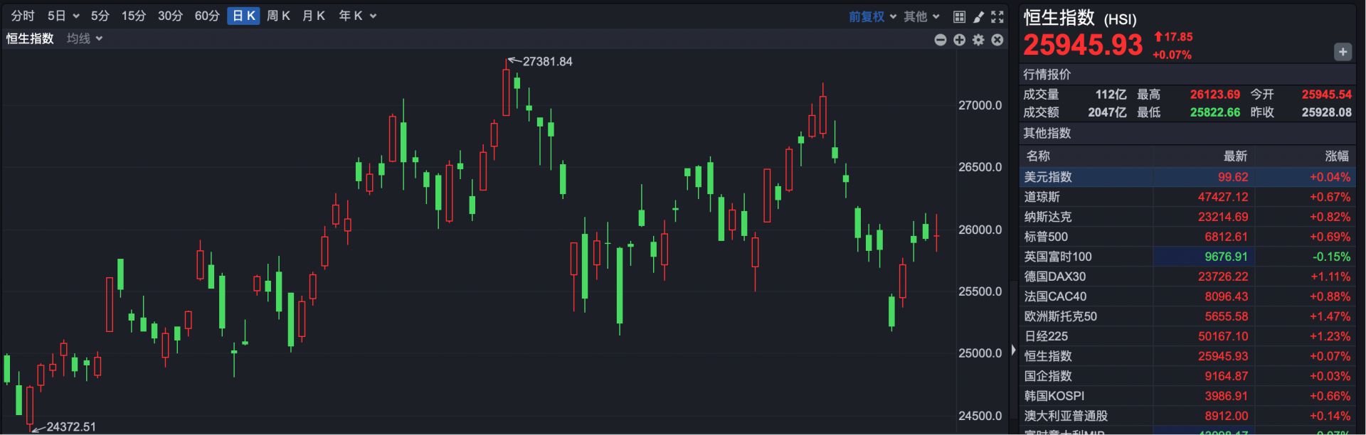 截至收盘,恒生指数报收于25945.93点,上涨17.85点,涨幅0.07%。港股市场全天仅成交1983亿港元,较昨日进一步萎缩。