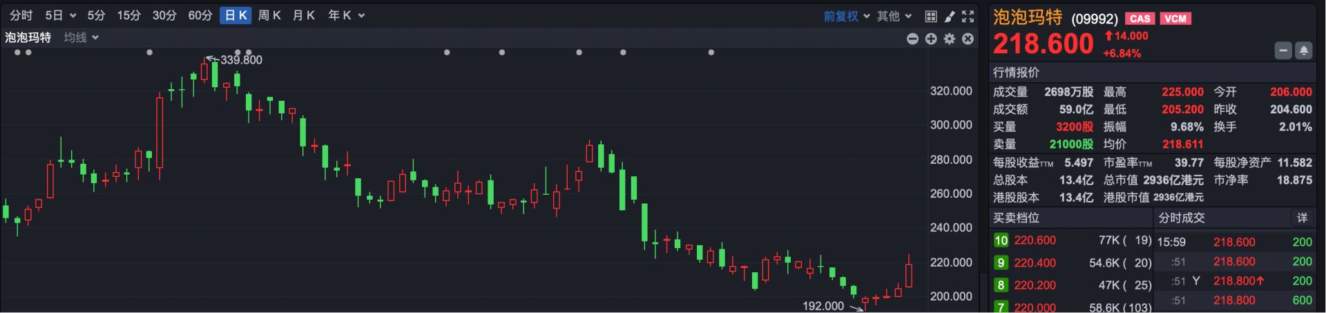 除了泡泡玛特外,布鲁可(HK00325)涨超7%,老铺黄金(HK06181)涨超4%,毛戈平(HK01318)涨超3%。