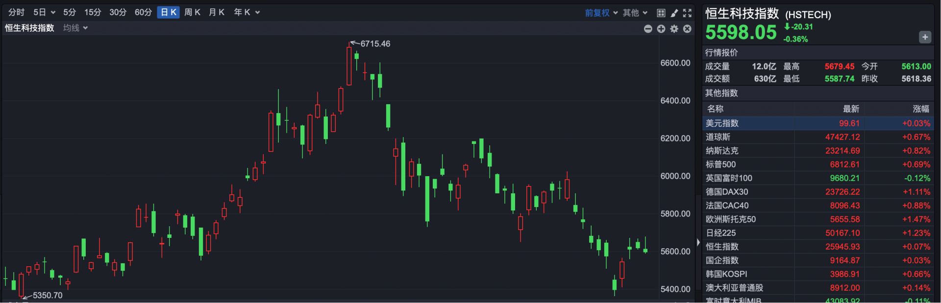 恒生科技指数报收于5598.05点,下跌20.31点,跌幅0.36%,连涨势头就此止步。