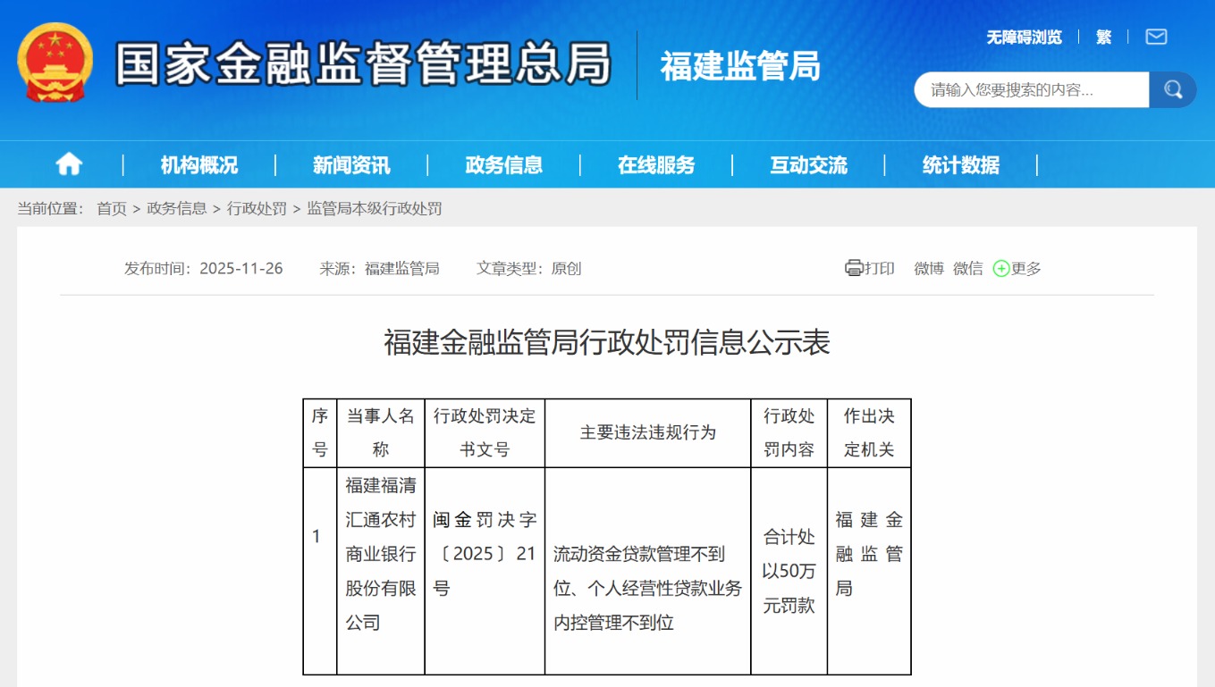 11月26日,据福建金融监管局行政处罚信息公开表显示,福建福清汇通农村商业银行股份有限公司(简称“福清汇通农商银行”)因流动资金贷款管理不到位、个人经营性贷款业务内控管理不到位,被合计处以50万元罚款。