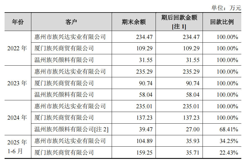 值得一提的是,族兴新材按单项计提坏账准备的客户中包含惠州市族兴达实业有限公司、温州族兴颜料有限公司等包含“族兴”商号的企业。