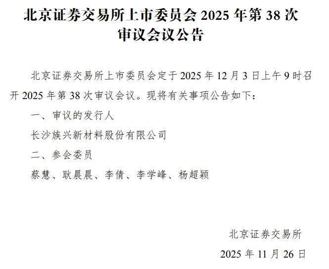 根据北交所上市委会议11月26日公告,长沙族兴新材料股份有限公司(简称“族兴新材”)将于12月3日上会审议。