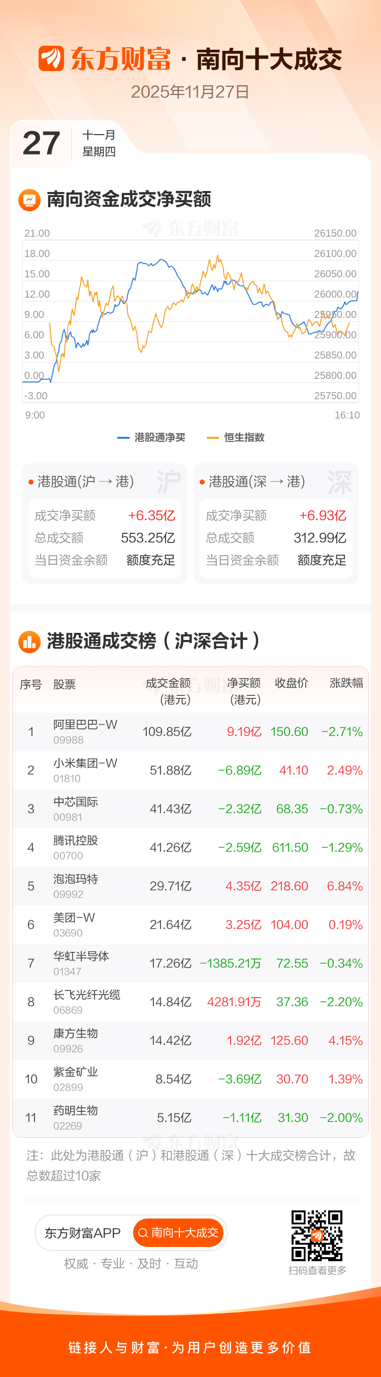 11月27日南向资金净买逾13亿港元,逾9亿抢筹阿里巴巴-W