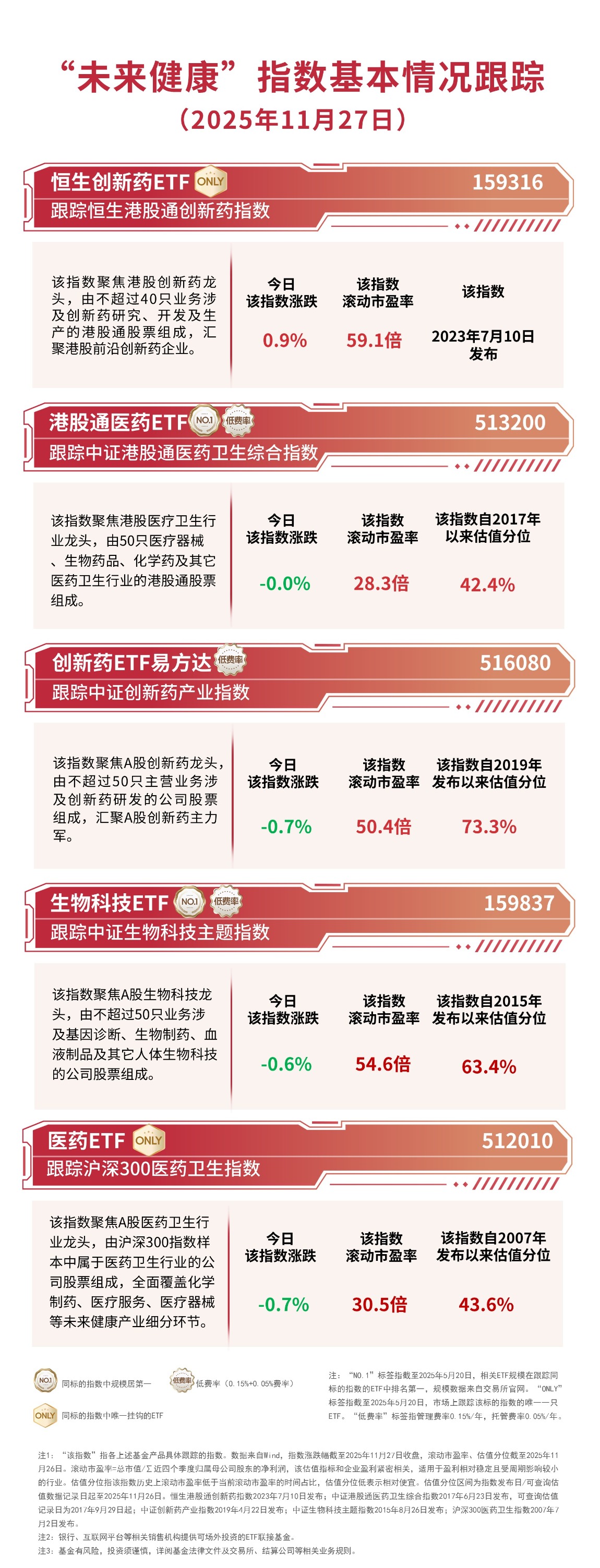 医药行业今日震荡分化,A股医药板块集体低位震荡;港股医药板块宽幅震荡小幅收跌,创新药细分板块强势领涨。截至收盘,恒生港股通创新药指数上涨0.9%、实现“四连阳”,中证港股通医药卫生综合指数下跌0.01%,中证生物科技主题指数下跌0.6%,中证创新药产业指数、沪深300医药卫生指数均下跌0.7%。