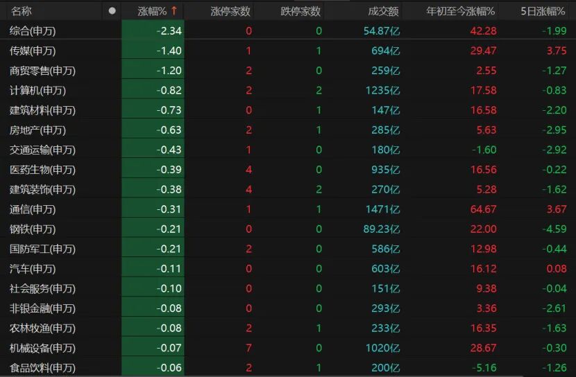 综合板块回调逾2%,传媒、商贸零售、计算机、建筑材料等板块收跌,跌幅相对温和。