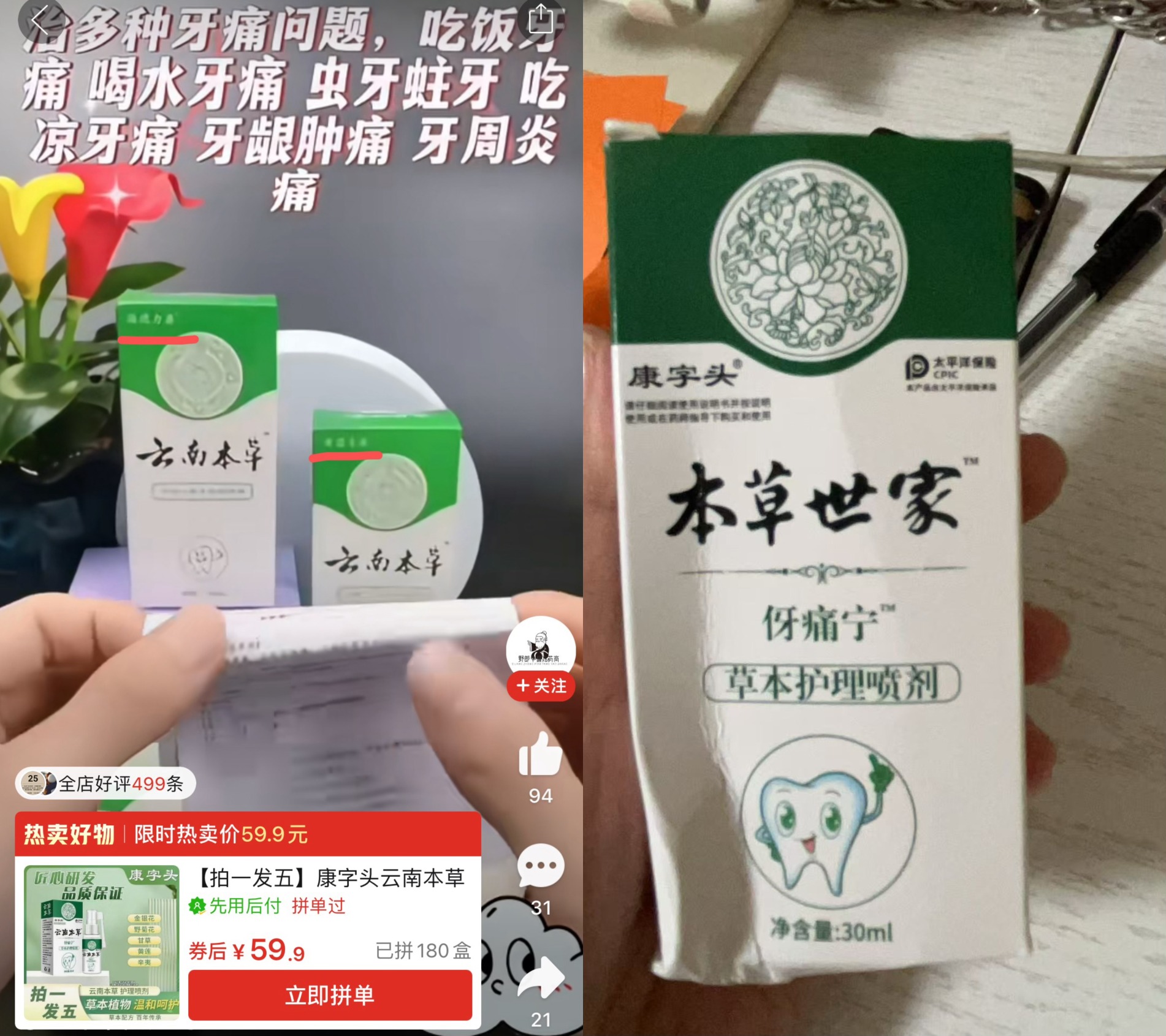 “康字头工厂直发店”内的另一版本视频中(左图),出现产品为澳德力康云南本草牙痛宁草本抑菌喷剂,与所挂购买链接的产品不符;记者收到的产品为康字头本草世家伢痛宁草本护理喷剂(右图)。
