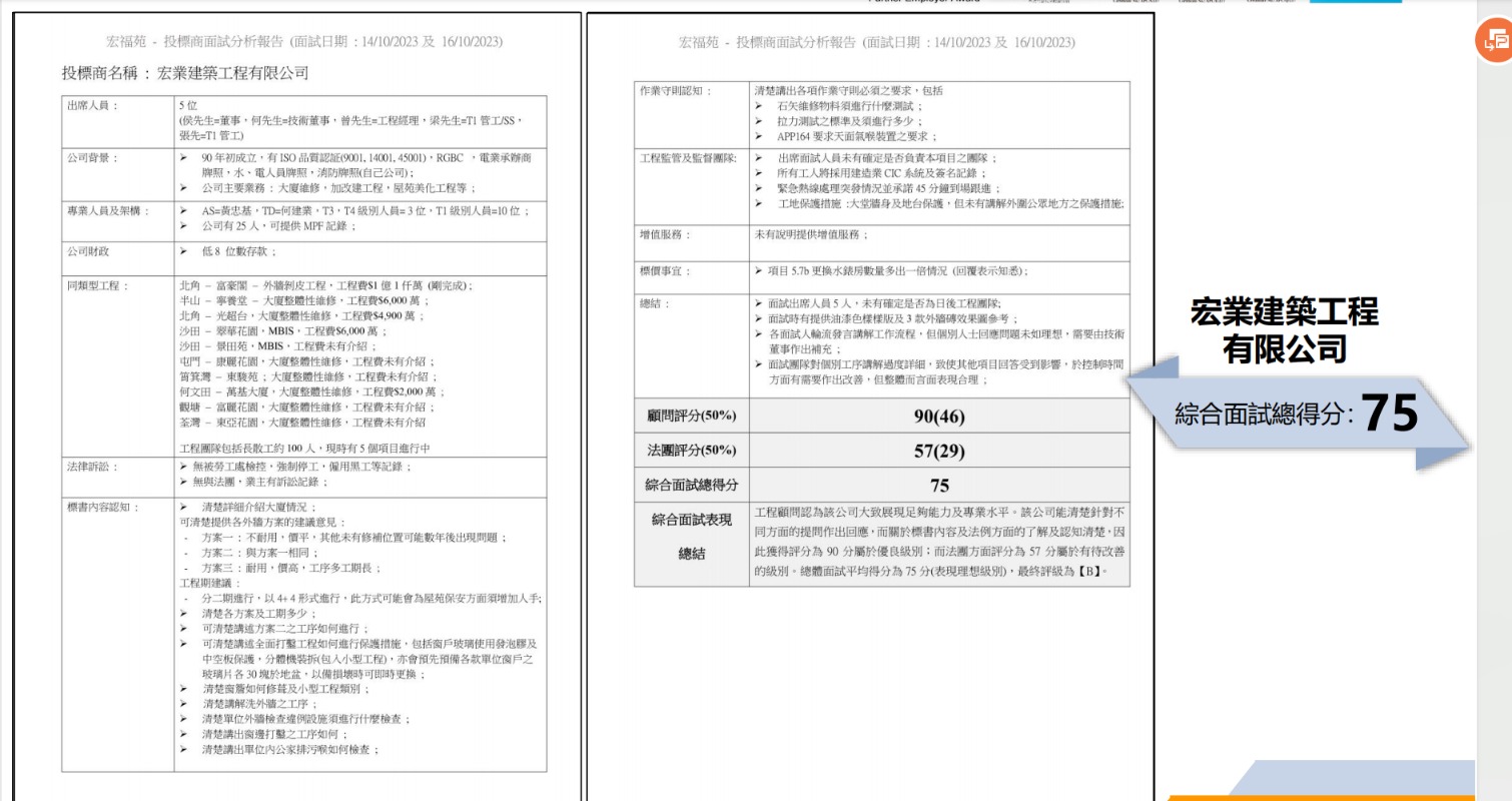 2023年10月,法团管委会面见了包括宏业建筑在内的14间回标承建商,宏业建筑综合面试总得分为75分,评级为B,面见后最终有5间承建商符合要求。2024年1月28日,业主大会议决拣选宏业建筑为强制验楼计划的修葺工程承建商。