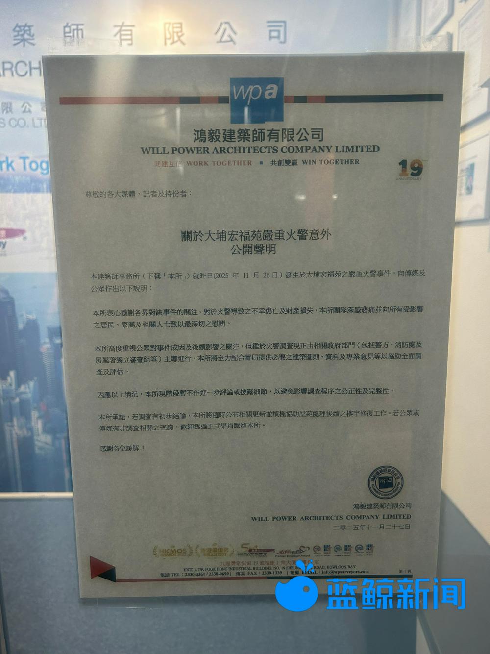 随后记者来到鸿毅建筑师有限公司,发现其在办公室门外张贴了公开声明,称该所高度重视公众对事件成因及后续影响的关注,但鉴于火警调查现正由相关政府部门主导进行,该所将全力配合当局提供必要之建筑图则、资料及专业意见等以协助全面调查及评估。“因应以上情况,本所现阶段暂不作进一步评论或披露细节,以避免影响调查程序之公正性及完整性。本所承诺,若调查有初步结论,本所将适时公布相关更新并积极协助屋苑处理后续之楼宇修复工作。”该声明显示。