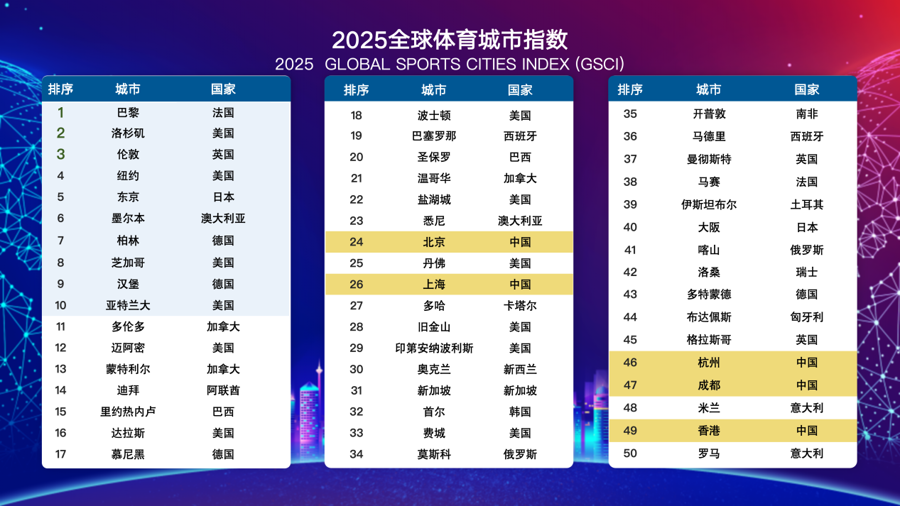 刘东锋教授补充介绍:“中国城市的表现尤为亮眼,北京(第24位)、上海(第26位)、杭州(第46位)、成都(第47位)、香港(第49位)五城成功入围全球50强,较往年排名稳步提升,这表明中国城市在赛事运营、体育产业生态构建、公共体育服务等方面的综合实力,已获得国际社会的广泛认可。”