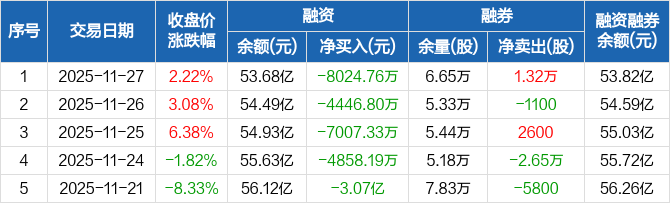 兆易创新:融资净偿还8024.76万元,两市排名第18(11-27)