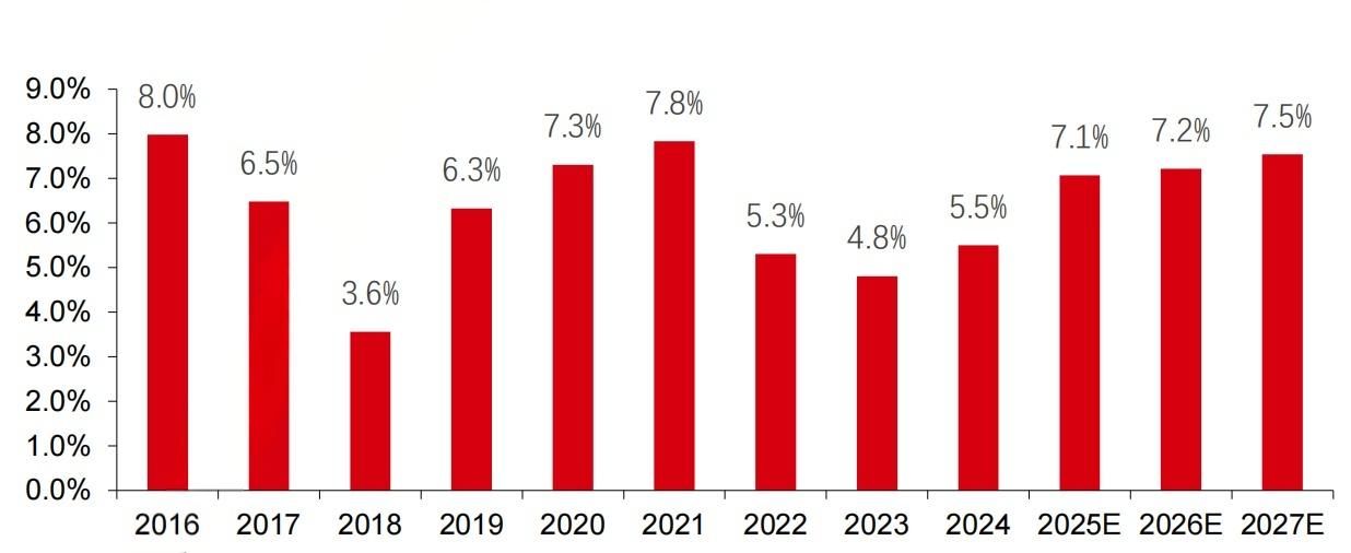 业内预计,随着市场景气度持续回升,未来几年证券行业的ROE水平有望稳步提升。中信证券预测,今年证券行业ROE有望达到 7.1%,接近2019年-2021年上轮牛市水平。在“十五五”规划积极发展股权、债券等直接融资,稳步发展期货、衍生品和资产证券化的方向下,多项业务有望在2026年继续实现复苏。在2026年日均股基成交额达到2.1万亿元,股权融资规模达到8500亿元,两融期末余额达到2.6万亿元,上证指数达到4250点的假设下,证券行业ROE有望继续实现稳步提升至7.2%左右。