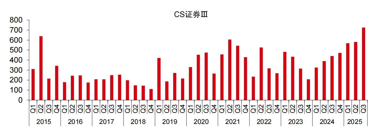 2025年下半年以来,得益于市场成交额上行,股权融资复苏,两融规模创历史新高以及A股市场走强,券商板块业绩在2025年三季度呈现强劲环比增长,单季度实现扣非归母净利润 678.53 亿元,环比增长31%,CS证券Ⅲ指数成分股第三季度归母净利润达725亿元,创下单季度历史新高。