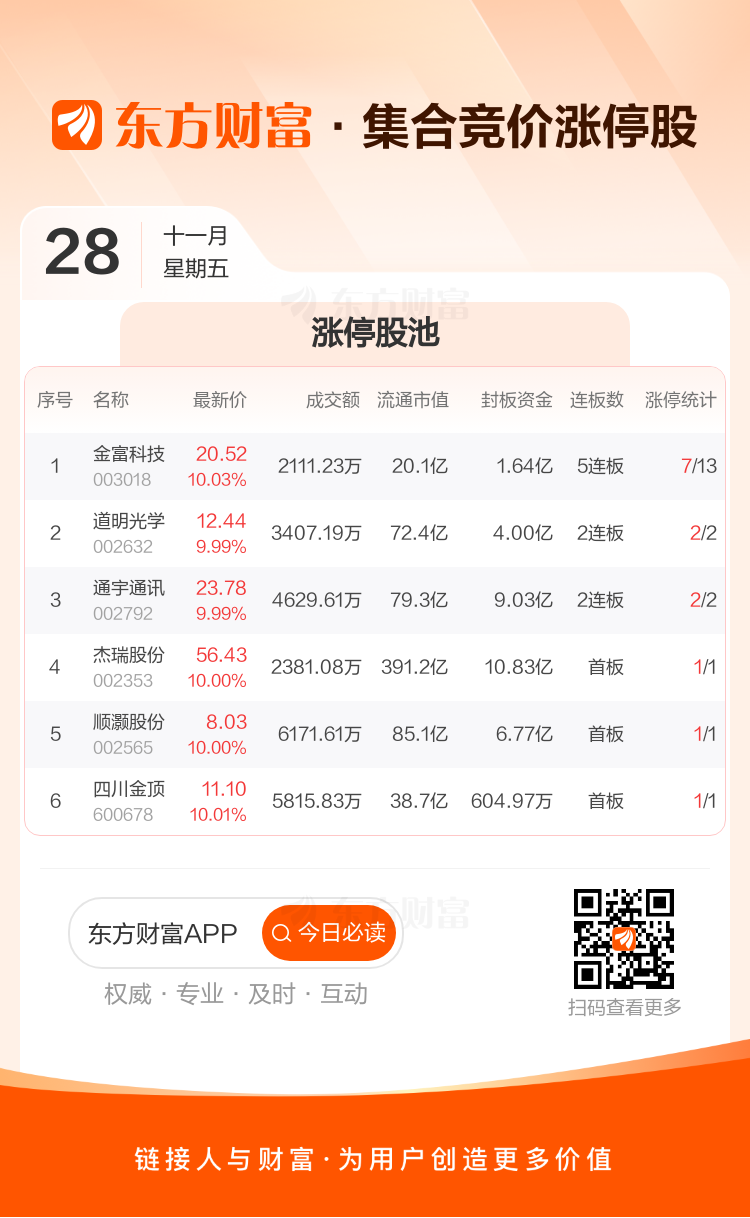 11月28日集合竞价:金富科技5连板 道明光学2连板