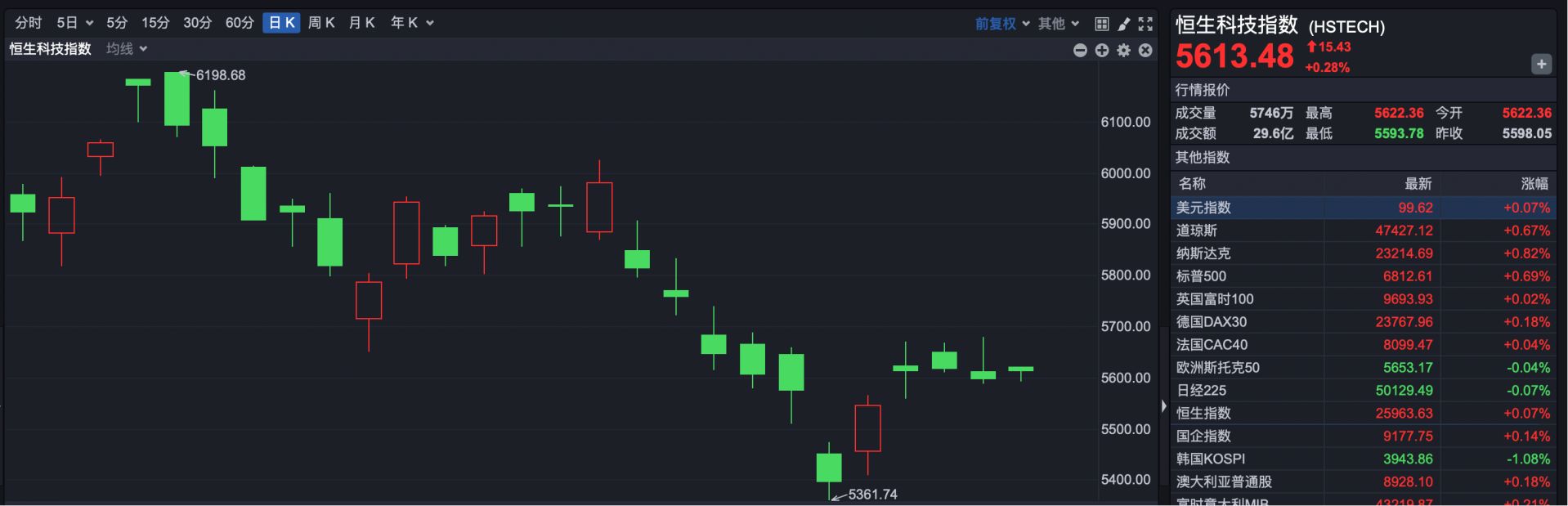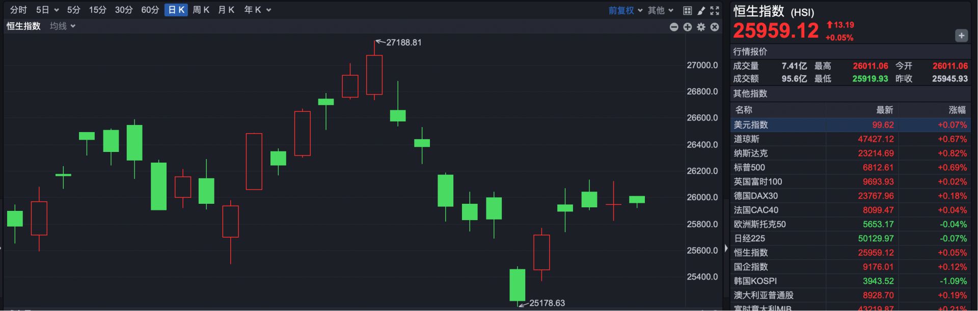 截至发稿,恒生指数报25959点,涨幅0.05%。