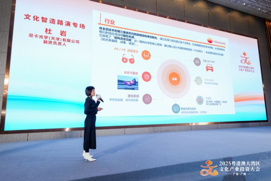 11月27日,在2025粤港澳大湾区文化产业投资大会(广东·广州)文化智造路演专场上,尼卡光学(天津)有限公司融资负责人杜岩以一个精准的比喻定义了公司的位置:“尼卡光学是一个金矿旁边卖铲子的项目。”在AR眼镜市场爆发的前夕,这家专注于微纳体全息技术的公司,正通过解决核心部件的成本与量产难题,成为推动行业普及的关键力量。