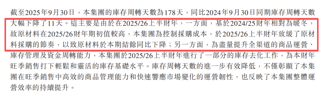 另一方面,为尽量提升全渠道的商品运营、库存管理及资金周转能力,公司于2025/26上半财年进行了一部分的库存去化工作,这为本财年旺季销售打下轻松和灵活的库存基础水平。