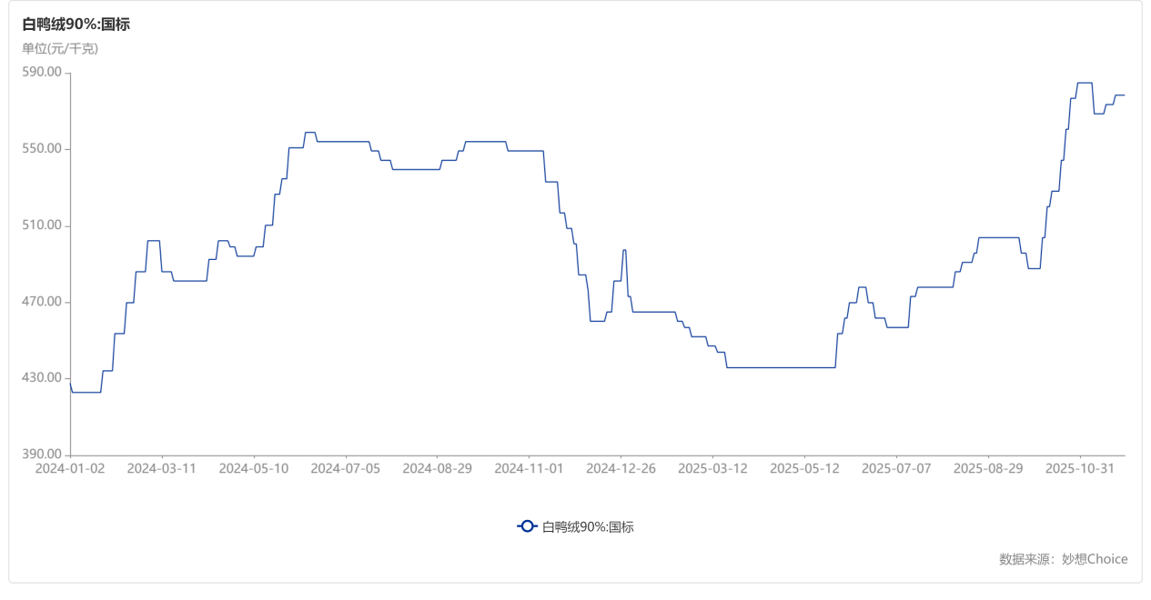 可风云突变。进入2025年10月,鸭绒价格走出一波凌厉的上攻趋势,11月初价格一度超过580元/千克,较2024年4-5月低点已经上涨超过了30%;仅10月这一个月就上涨了约20%。
