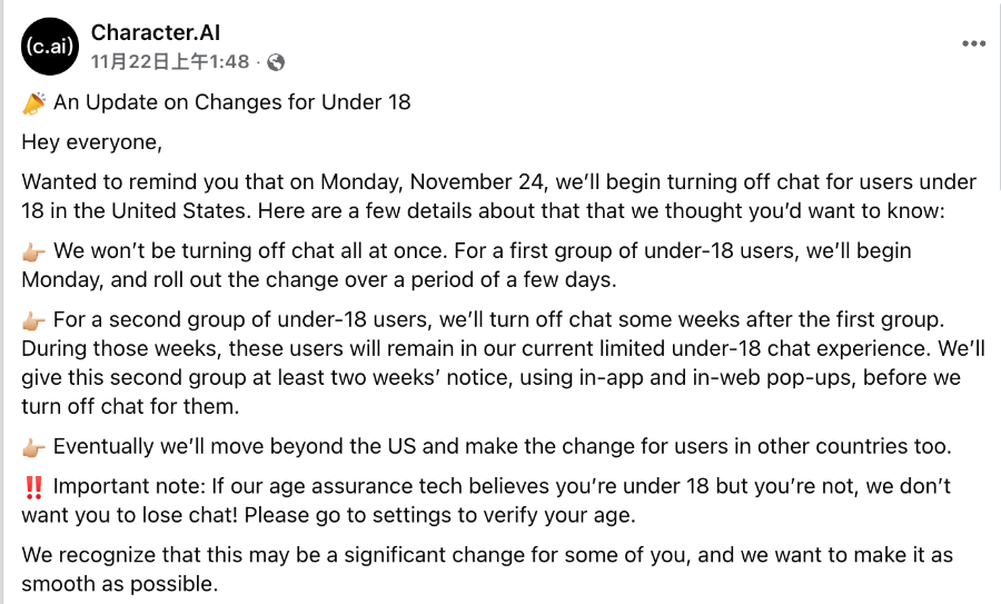 (Character.AI表示,将分批次停止对美国未成年人提供服务,并希望最终可以影响到更多国家。)