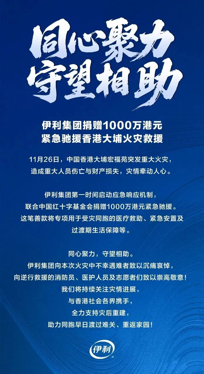 伊利集团联合中国红十字基金会捐赠1000万港元紧急驰援。这笔善款将专项用于受灾同胞的医疗救助、紧急安置及过渡期生活保障等。