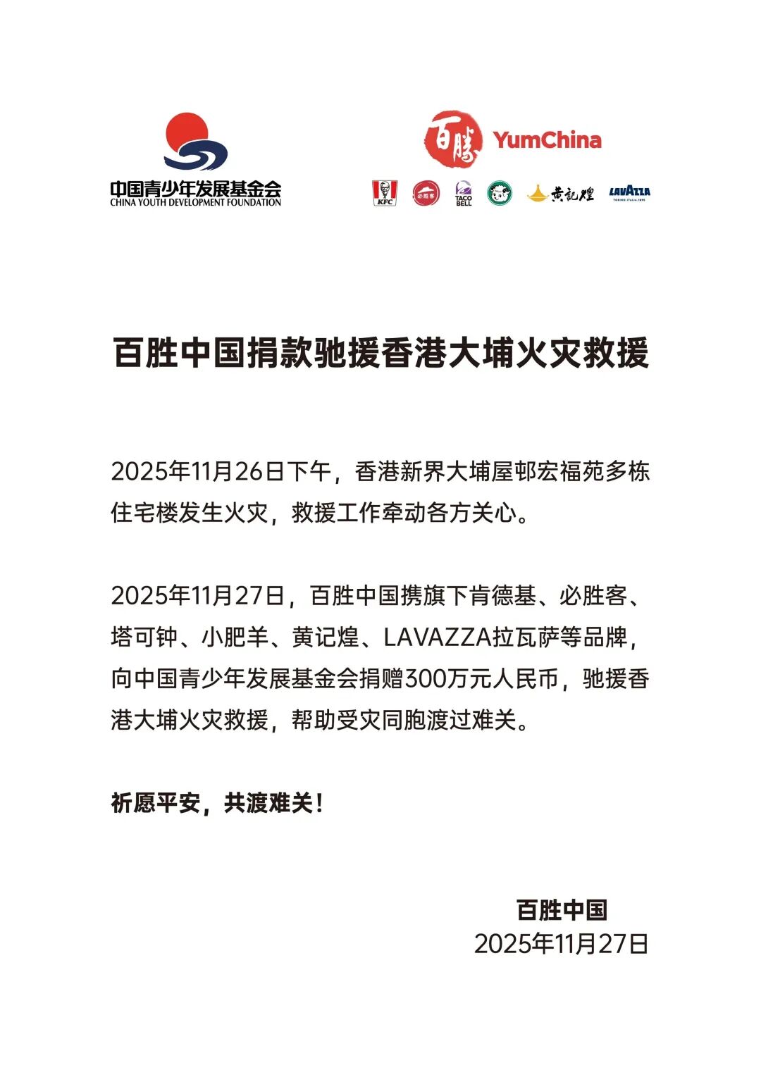百胜中国携旗下肯德基、必胜客塔可钟、小肥羊、黄记煌、LAVAZZA拉瓦萨等品牌向中国青少年发展基金会捐赠300万元人民币,驰援香港大埔火灾救援,帮助受灾同胞渡过难关。