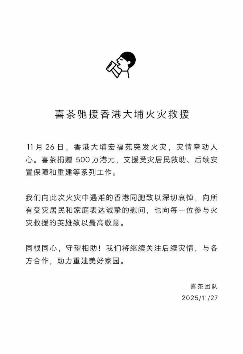 喜茶捐赠500万港元,全力支援受灾居民救助、后续安置保障和重建等系列工作。