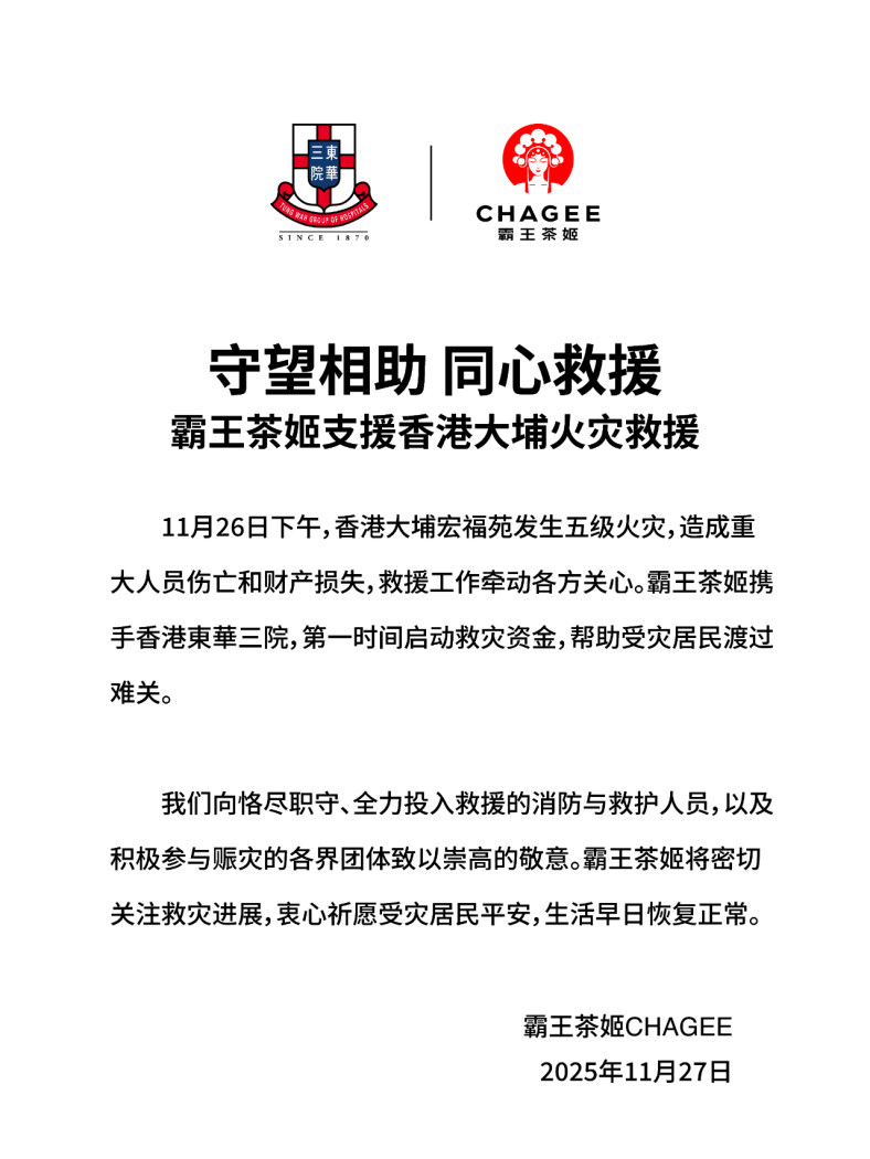 霸王茶姬则携手香港東華三院,第一时间启动救灾资金,帮助受灾居民渡过难关。