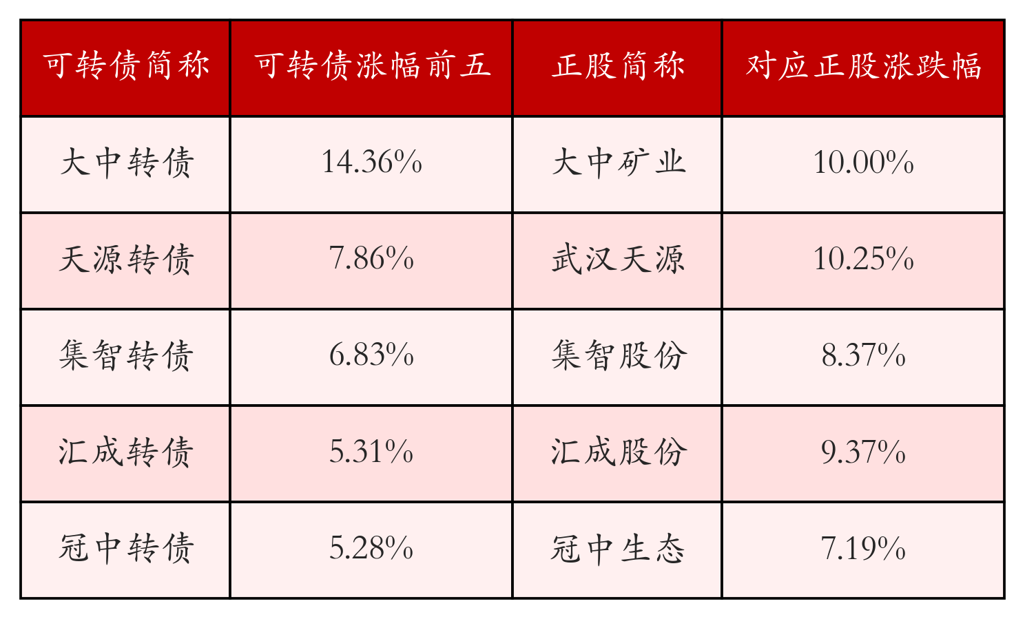 南财智讯11月28日电,南财金融终端盘后数据显示,债市方面,中证转债指数收涨0.68%,报481.63,成交额为593.68亿元。可转债方面,今日共成交394只可转债,其中342只收涨,1只收平,51只收跌。具体来看,36只可转债涨幅超过2%。其中大中转债(127070)涨14.36%,天源转债(123213)涨7.86%,集智转债(123245)涨6.83%。今日有6只可转债跌幅超2%,博23转债(113069)跌7.4%,阳谷转债(123211)跌4.97%,欧通转债(123241)跌3.19%。存在交易量的可转债所对应的正股中,292只收涨,7只收平,95只收跌。具体来看,25只可转债对应正股涨幅超过5%,其中,重庆建工(600939)涨停,收涨10.09%。同时所对应的可转债:建工转债(110064)同涨0.36%。今日有0只可转债对应正股跌幅超过5%,没有正股跌停。